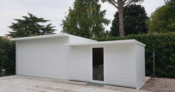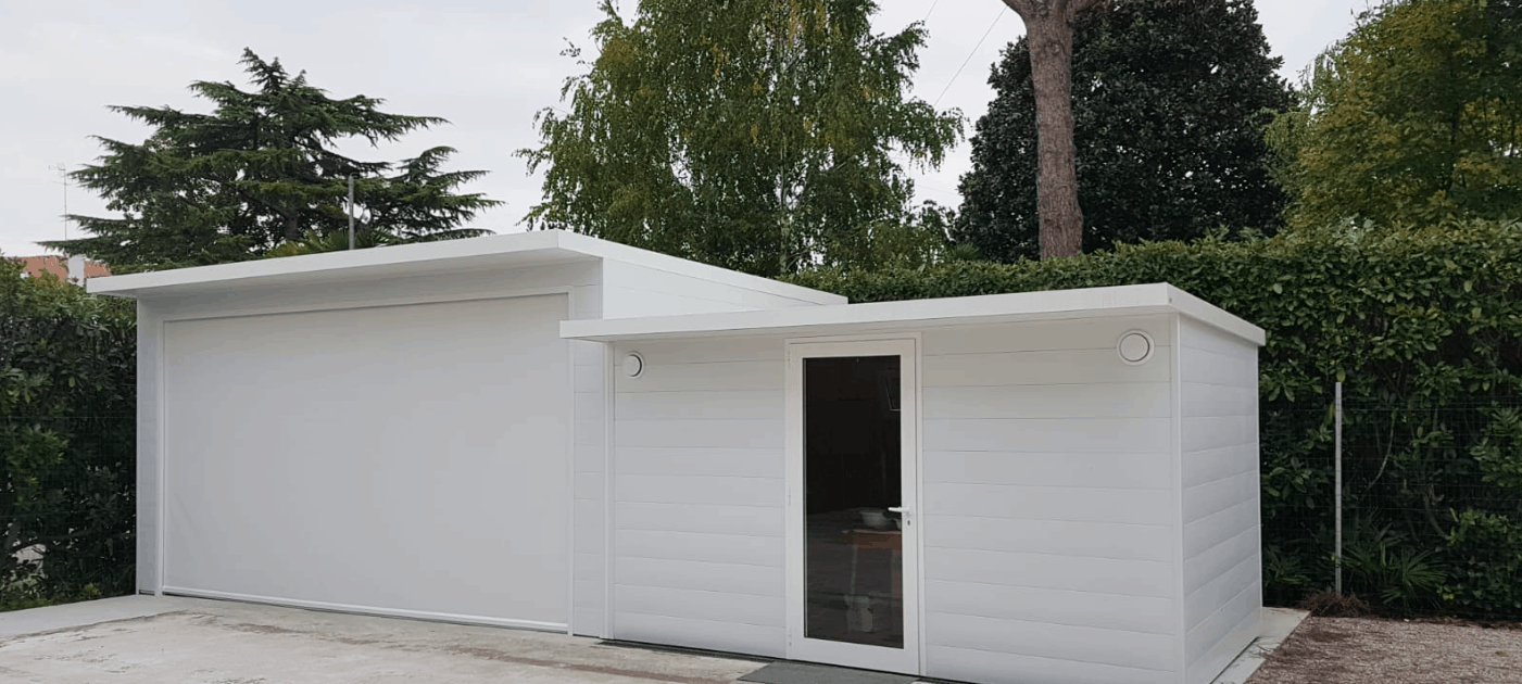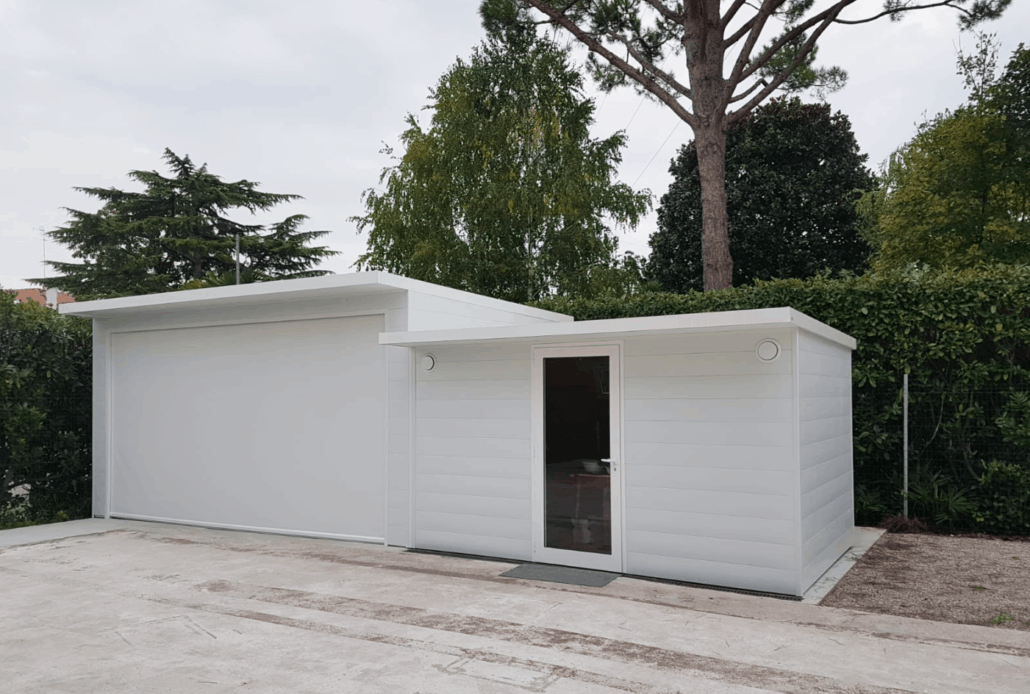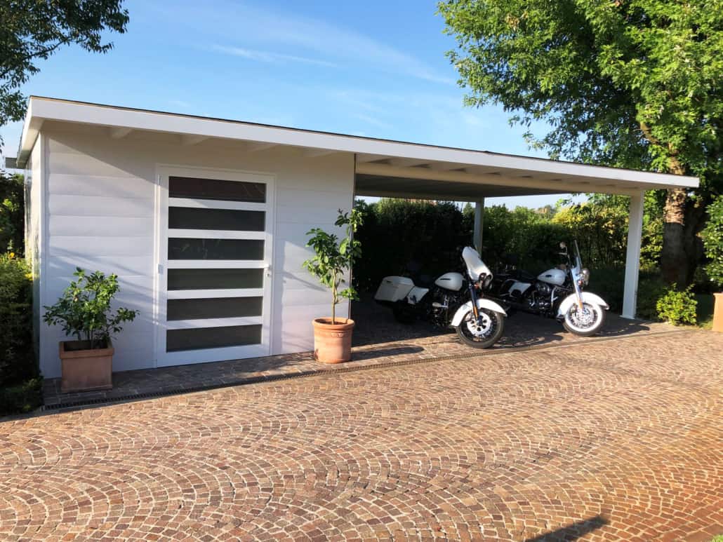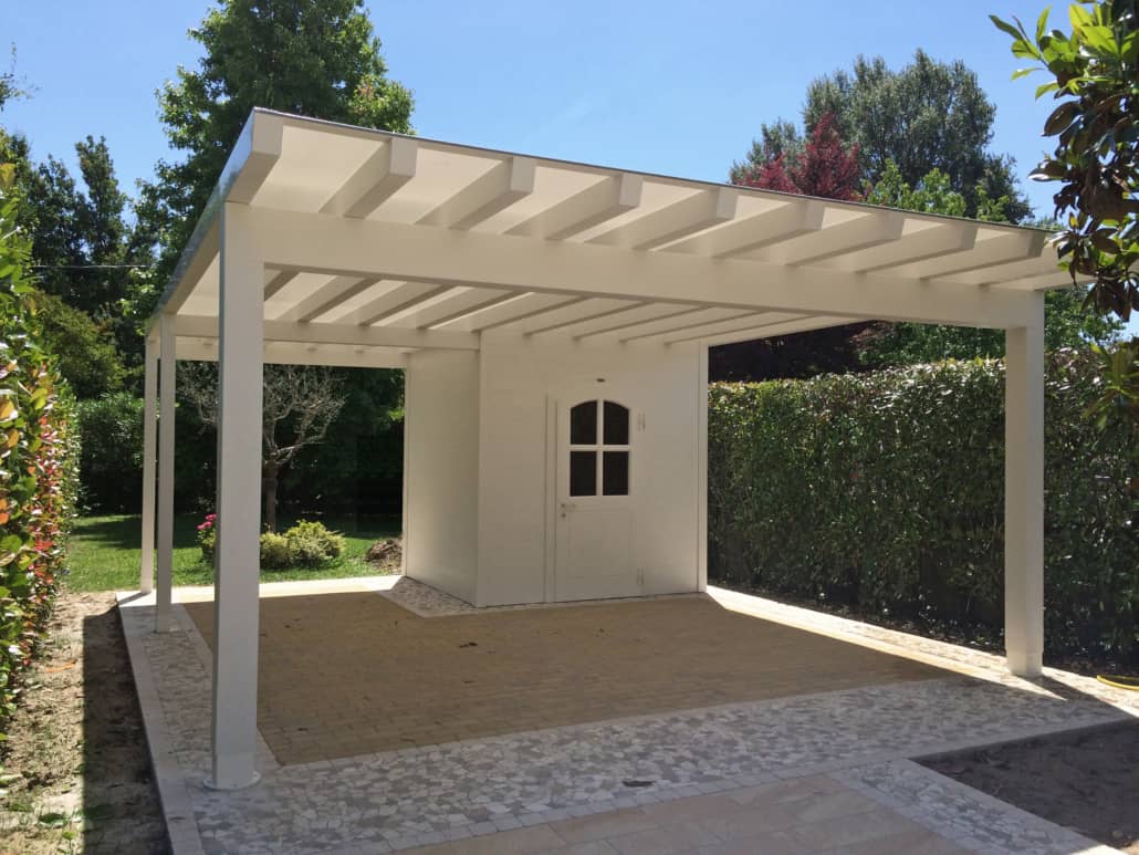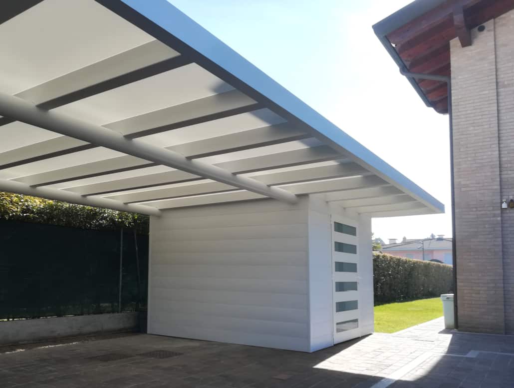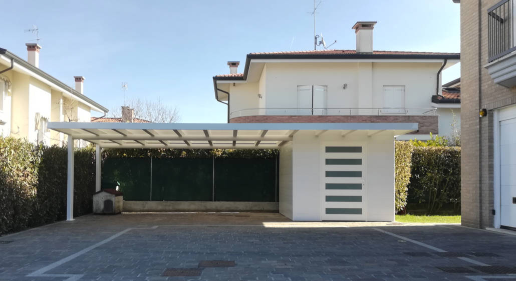 - CARPORT CON CASETTA INTEGRATA permettono di unificare gli spazi ed uniformare linee architettoniche integrando una zona chiusa, adibita a ricovero attrezzi, ad una zona parcheggio sostenuta in questo caso solamente da 2 pilastri