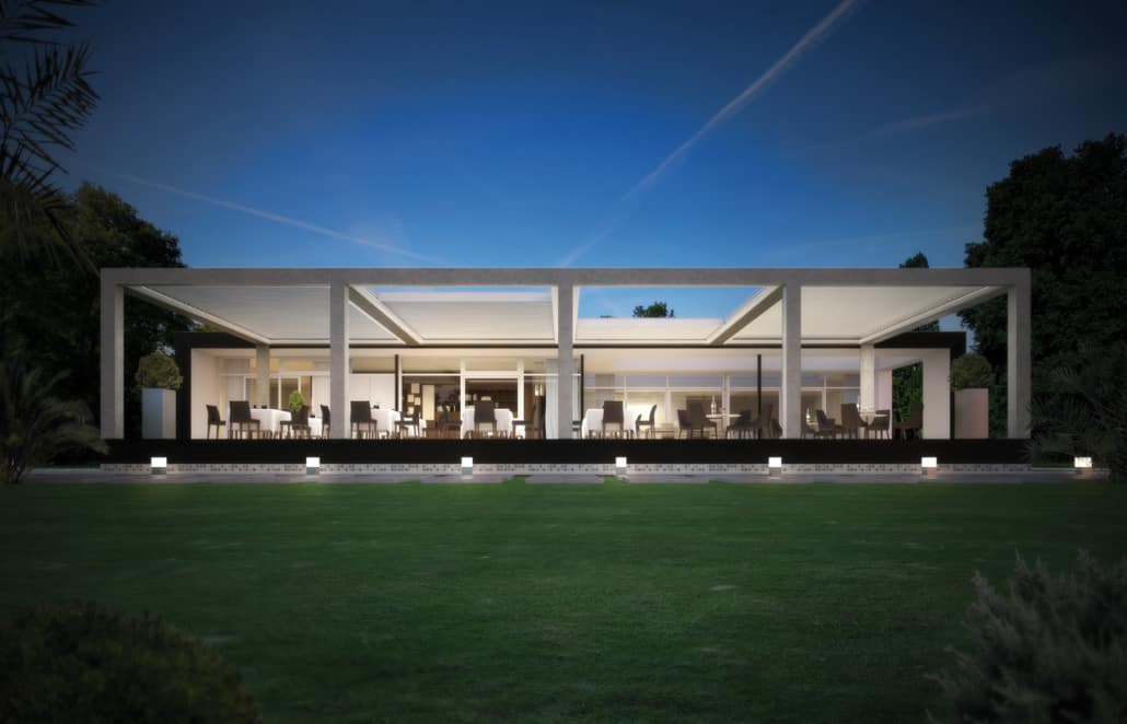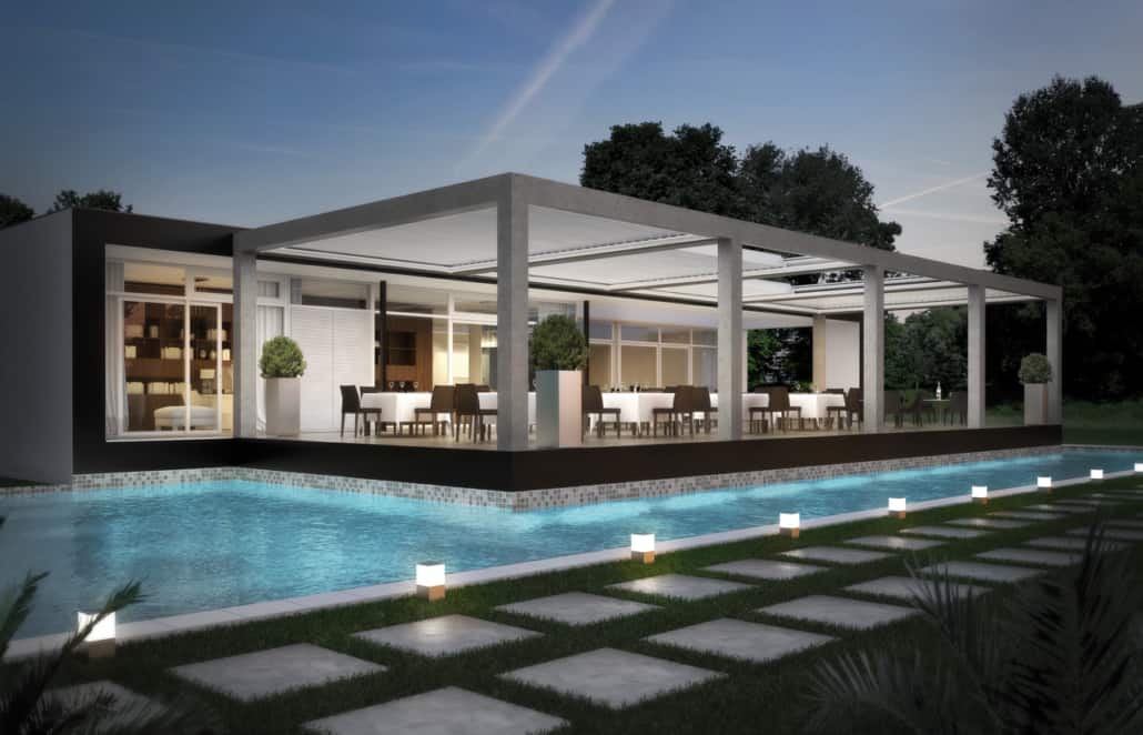 Le grondaie integrate su tutto il perimetro permettono di convogliare l’acqua negli scarichi integrati all’interno dei pilastri, permettendo l’istallazione di chiusure vetrate scorrevoli o tende verticali shy zip ombreggianti per godere di un massimo comfort anche al mutare delle condizioni atmosferiche
