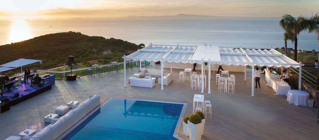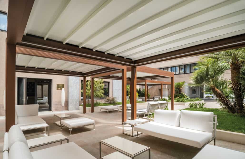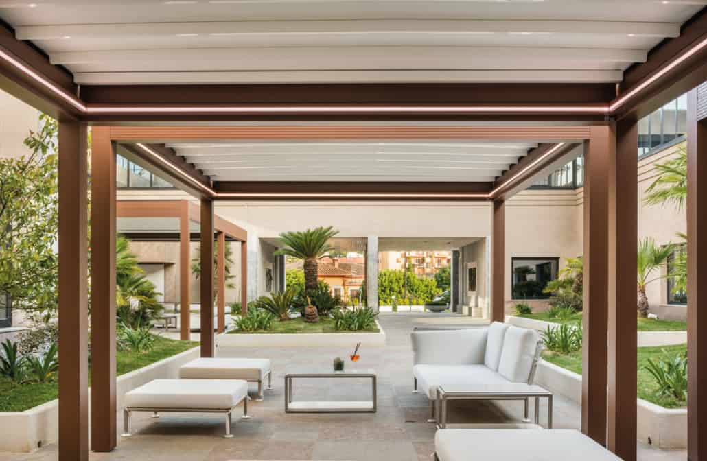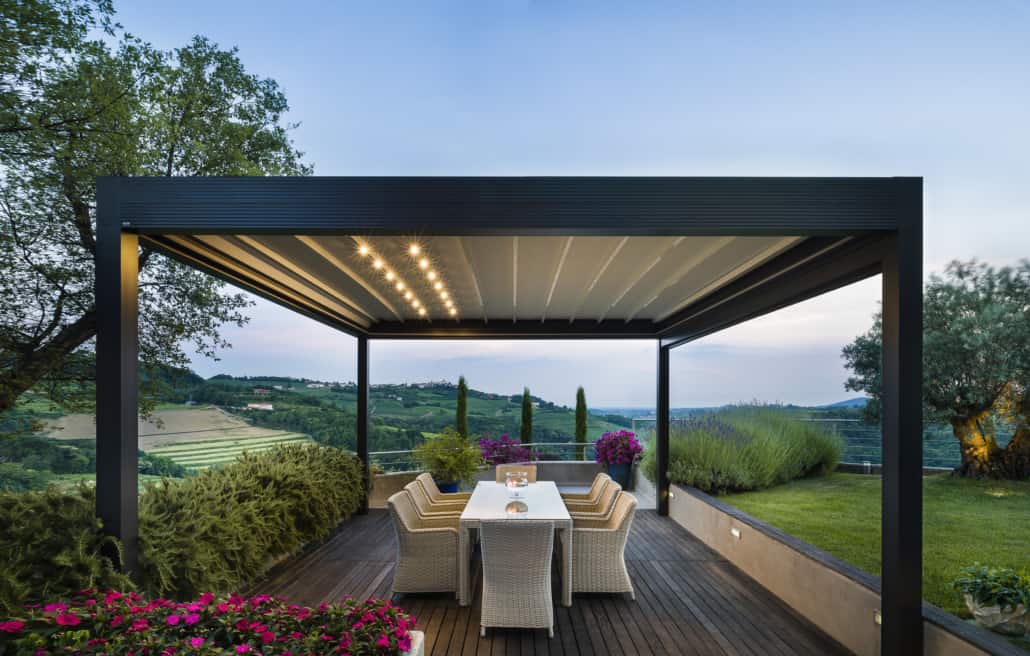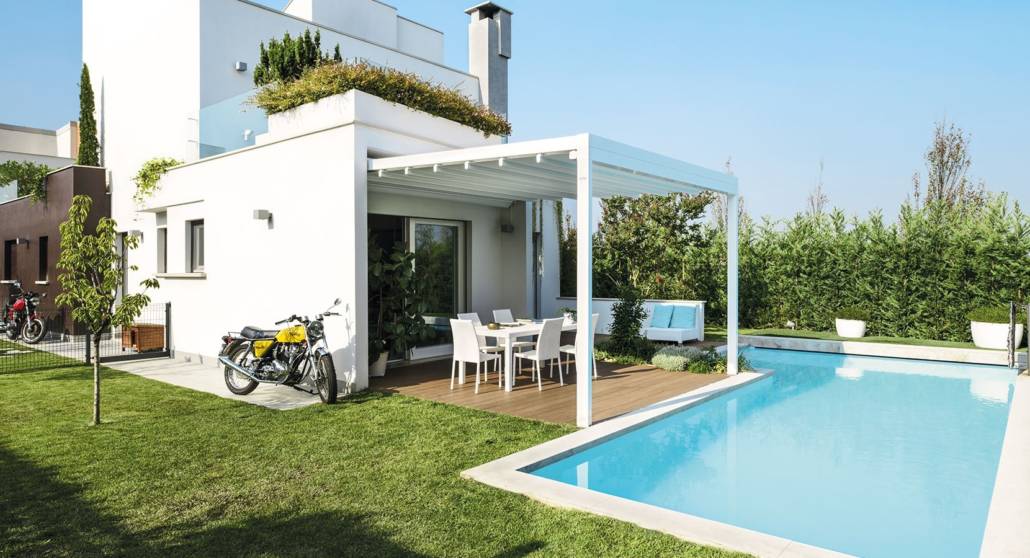 Pergola caratterizzata dalle spesse travi perimetrali realizzate in alluminio senza inclinazione e copertura in PVC apribile a pacchetto con profili frangitratta di sostegno calandrati per il deflusso delle acque meteoriche anche di forte intensità