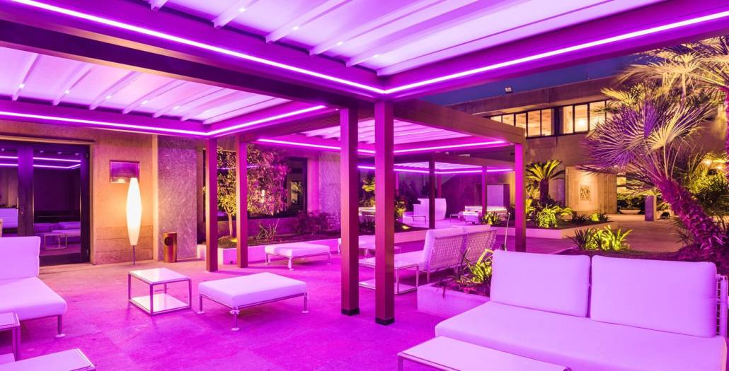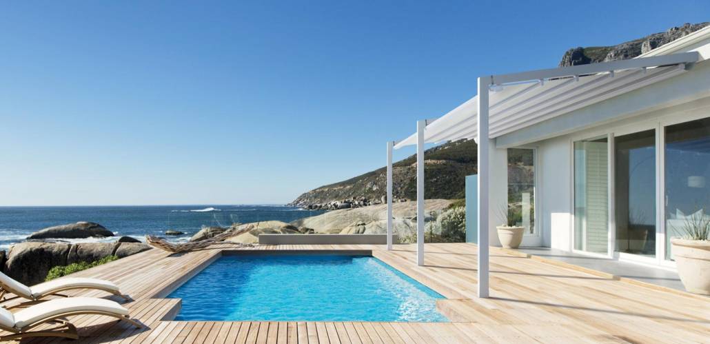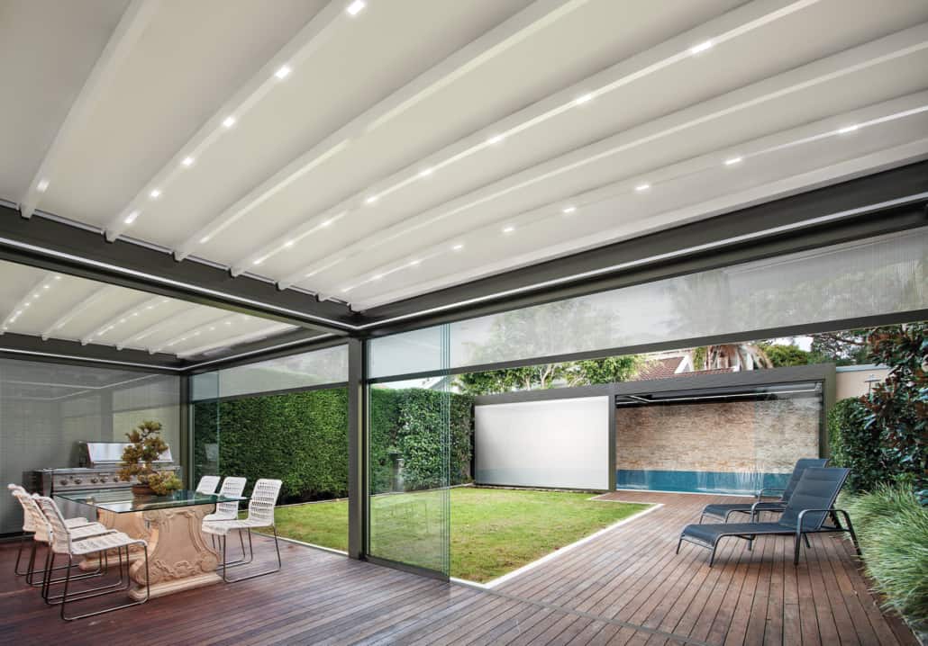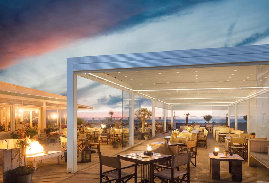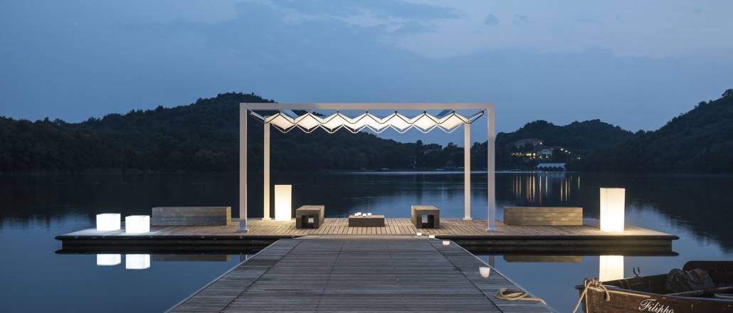La copertura in PVC, anche quando chiusa, rende possibile il passaggio della luce creando dei suggestivi giochi d’ombra ed è caratterizzata da numerosi trattamenti che la rendono resistente ai raggi UV, alghe e sbalzi di temperatura, adatta dunque a proteggere anche da pioggia e neve.