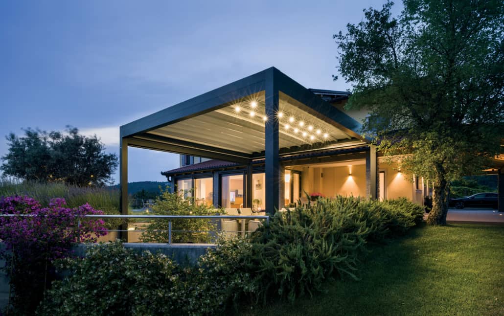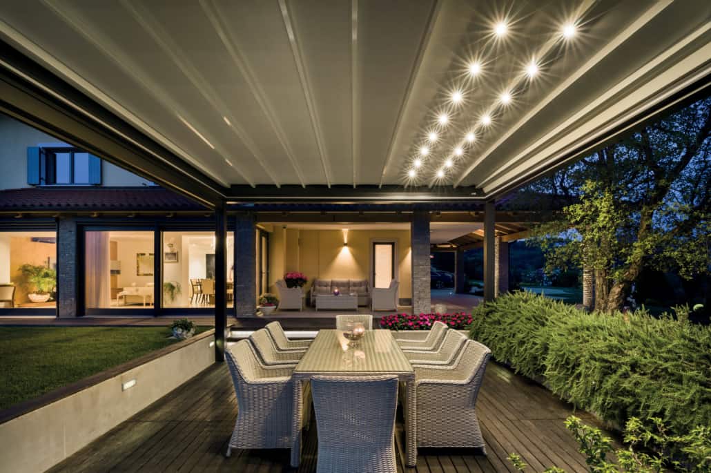 Le grondaie perimetrali integrano il sistema brevettato Anti-Splash,ovvero una sponda basculante che impedisce all’acqua di schizzare all’interno della pergola convogliandola negli scarichi all’interno dei pilastri compatibili con sistema INNER GUIDE, progetto che permette di integrare a scomparsa tende verticali shy zip abbinate a comode vetrate scorrevoli utili nei mesi più freddi